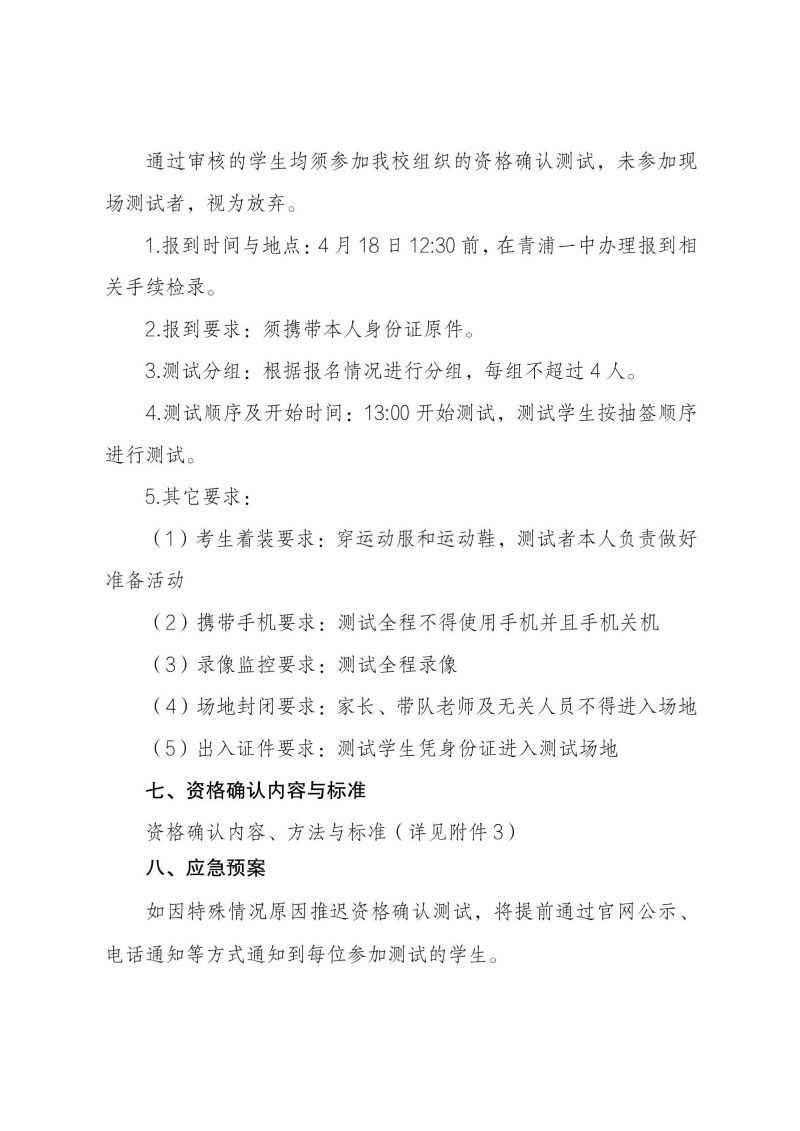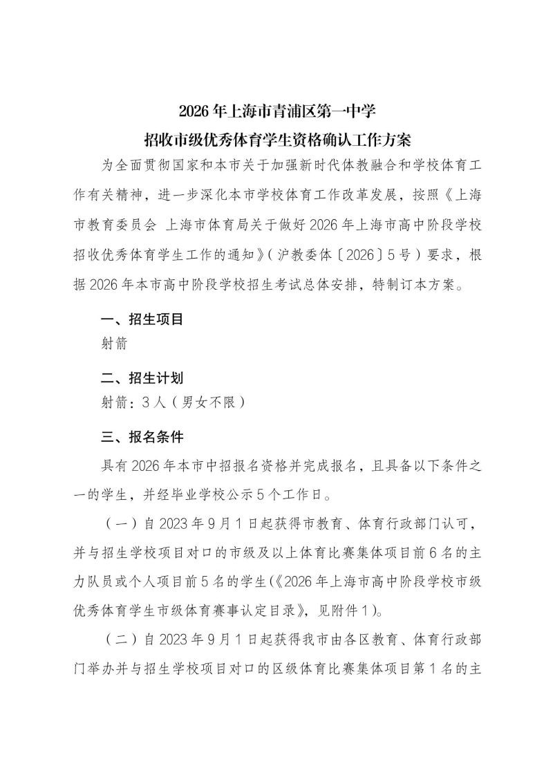 2026年青浦一中招收区级优秀体育学生资格确认工作方案