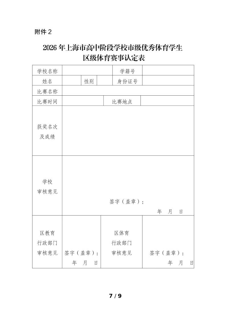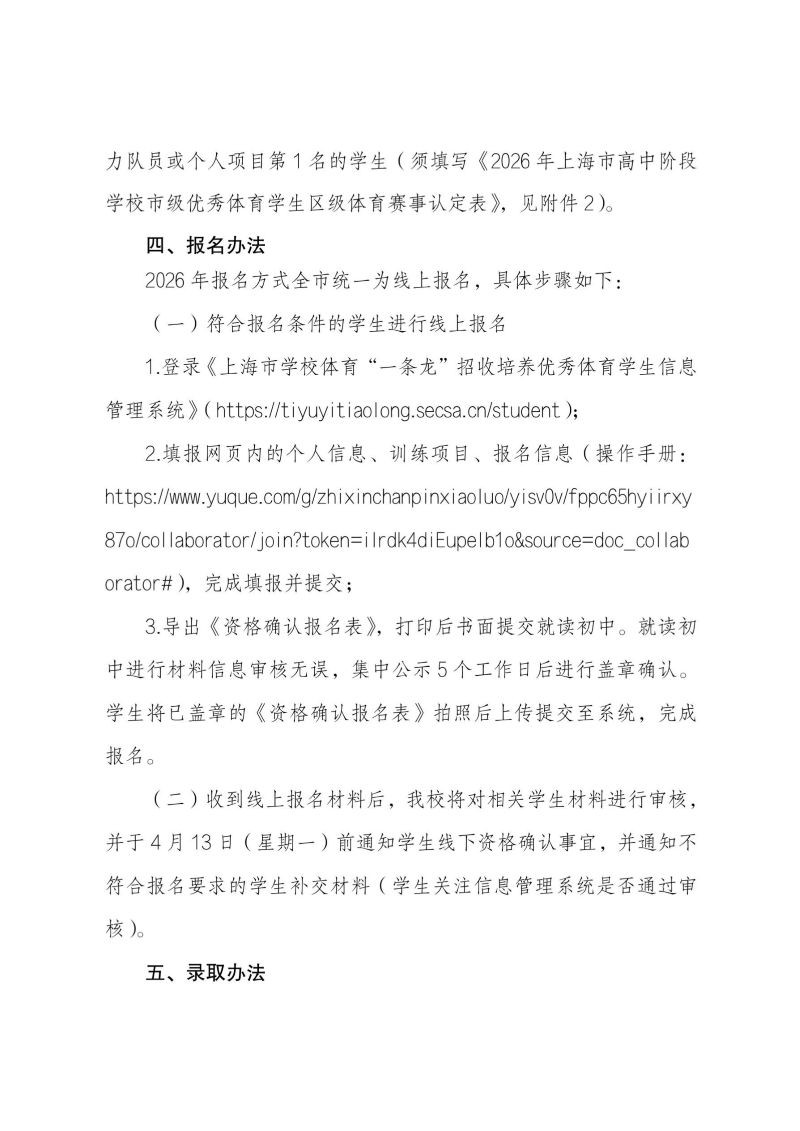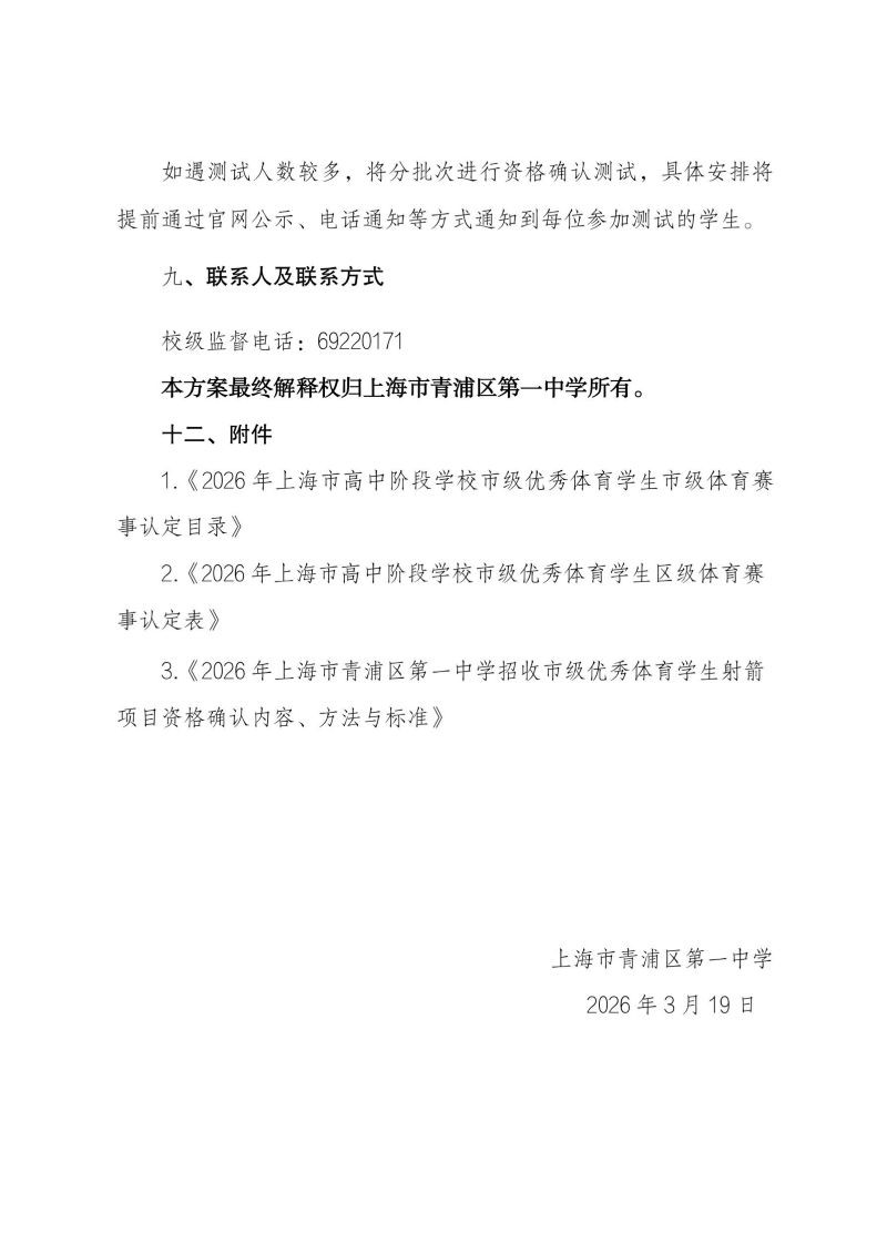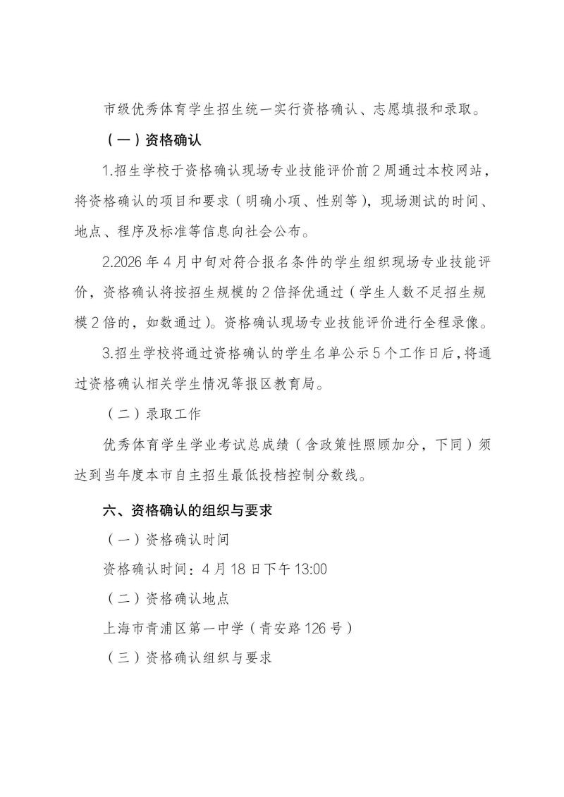 2026 年上海市青浦区第一中学招收市级优秀体育学生资格确认工作方案