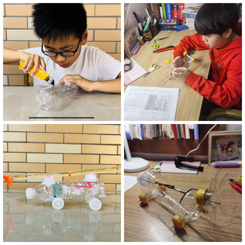 我型我秀项目简述:汽车已是现今社会人们日常生活中常用的出行工具,我国汽车保有量急速增大,意味着能源消耗增大,污染排放增多,汽车节能环保问题突出,汽车领域的节能和减排,对保障国民经济健康持续发展、保护我们赖以生存的环境具有重要的现实意义。请同学们变身为产品设计师,接受一项新挑战:不要马达、不要燃油,仅仅依靠随处可见的——空气作为动力,设计并制造一辆节能动力小车,材料不限,提倡废物利用。部分优秀作品如下。