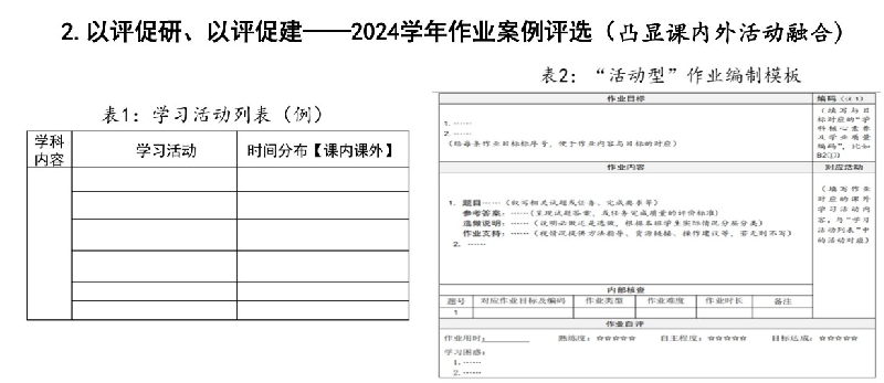 作业作为学生在课堂之外的学习活动,是教师有效设计和实施学习活动的重要载体。本学年高中思政学科以“活动型”作业案例评选为抓手,通过“学习活动列表”“作业案例模板”等工具,助力教师深入思考课堂教学活动与课外学习活动的融合设计。本次研讨活动中,全组老师结合区域开发的作业案例模板,解读了作业目标、作业内容、作业实施评价等模块的撰写要求,明确了作业目标与学业质量要求的一致性、作业内容与学习活动之间的关联性。