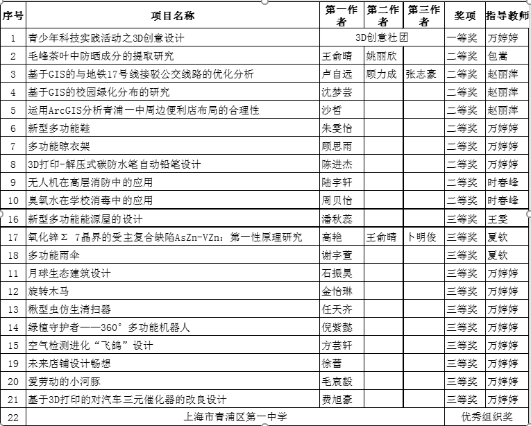 青浦一中学生在第34届上海市青少年科技创新大赛中共荣获22个奖项,其中市一等奖1项,市二等奖9项,市三等奖11项,学校荣获市优秀组织奖。